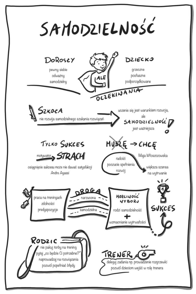 Po drugie: samodzielność będzie wyrażała się nie tylko możliwością podjęcia decyzji czy wyboru z dwóch dostępnych opcji, ale także samodzielnym rozwiązaniem danego zadania czy sytuacji. Stawiajcie tego typu wyzwania swoim dzieciom, zawodnikom. Małe, codzienne sytuacje mogą stwarzać taką możliwość (dojazd na trening, organizacja jakiejś części treningu, samodzielne złożenie puzzli, „statku”).